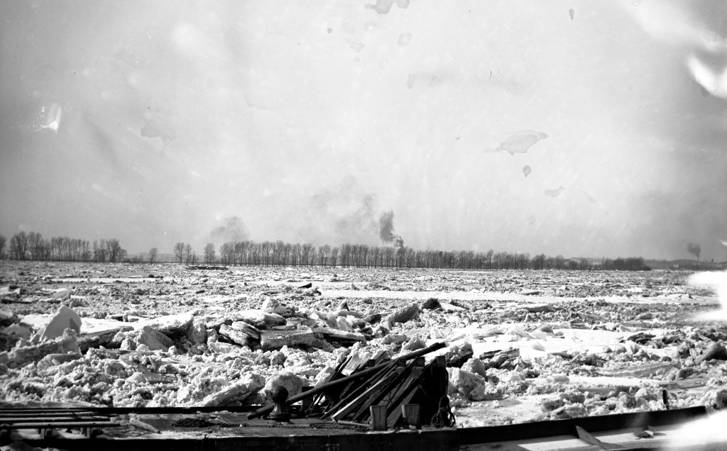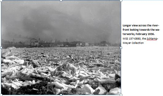 In the Evansville newspapers, the 1936 ice gorge seemed like a party, particularly as the gorge was breaking up later in February. From the front page of the Evansville Journal, February 24, 1936: “Thousands of cars passed the riverfront during the day viewing the scene from the foot of Main St. and various points on Ohio St. … Pedestrians and tourists filled the plateau atop the [Reitz] hill so that from a distance it resembled a piece of jam covered bread discarded at a picnic and taken over by ants.” On the same day the Evansville Press (p. 10) reported that 50, 000 saw the gorge break at Evansville. “Thousands of sightseers, many of whom motored to Evansville from other cities, jammed the river from Sunset Park to Ingle St. all day Sunday, watching the ice gorge break. … Several whistles were blown Sunday, signalling the break. Crowds filled the streets quickly, all running toward the river.”