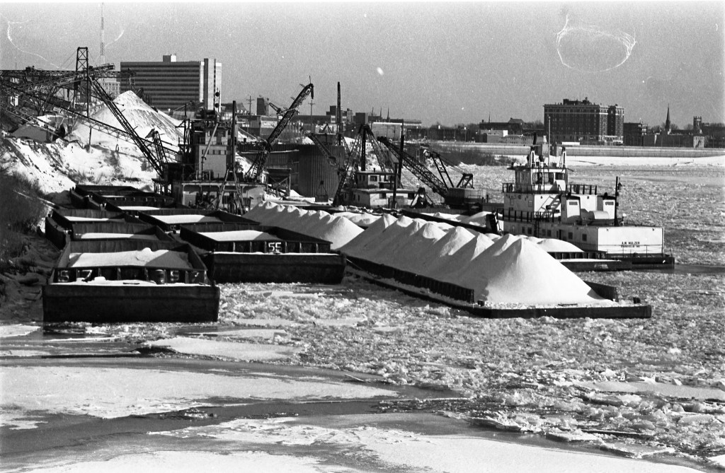 It happened again the winter of 1977. Although the ice does not look as impressive in this picture, it caused the barges and towboat shown here to be stuck on the riverfront. This location is probably near the end of NW Riverside Dr., where it turns into Fulton Ave. One of the tugboats says A.W. Mulzer, and Mulzer Crushed Stone (today’s name) is very near this location or may, indeed, be this specific location. The big building on the right is the McCurdy Residential Center Inc. at 101 SE 1st St. (formerly the Hotel McCurdy).