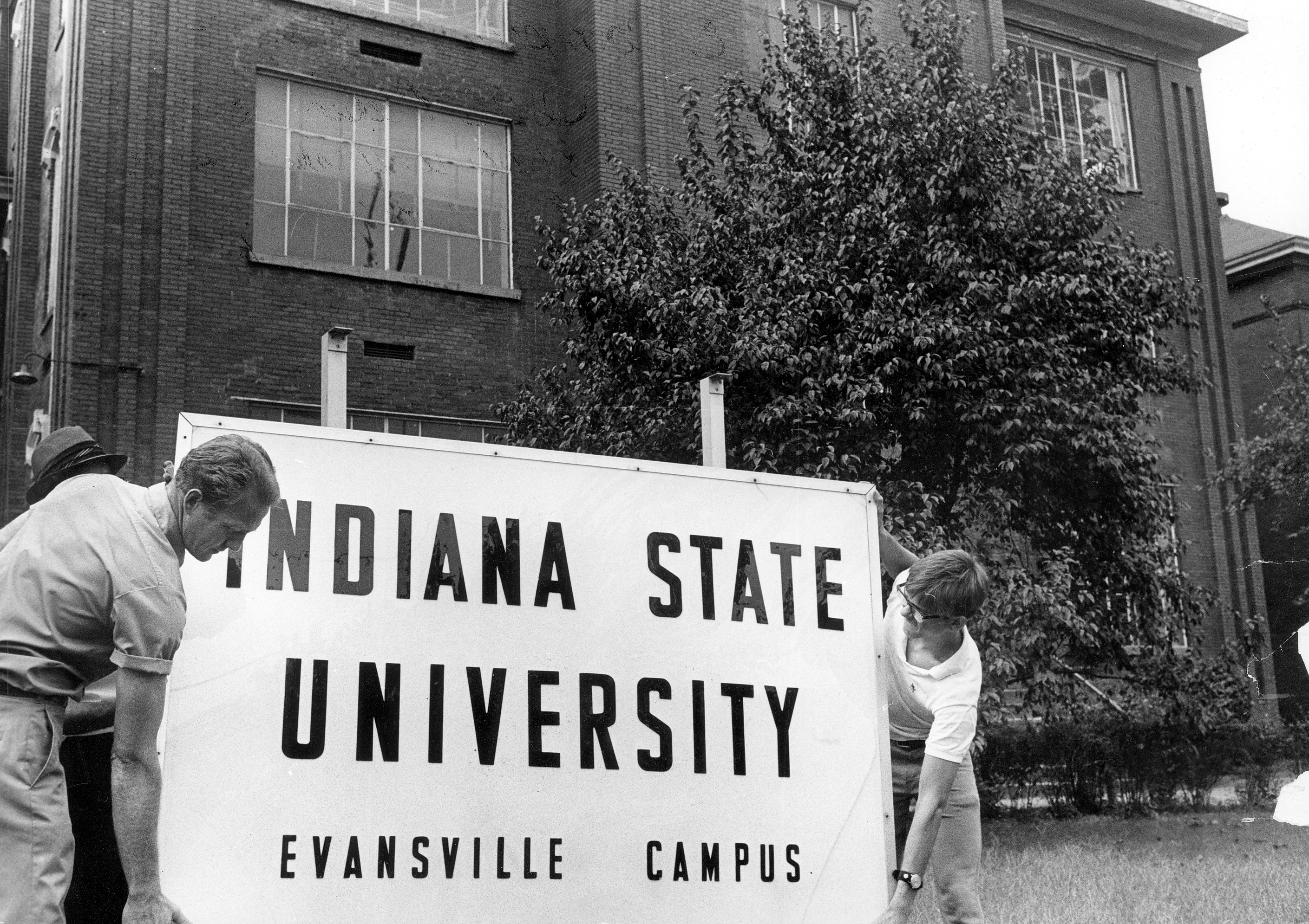 September 15, 1965 saw the first ISUE (Indiana State University, Evansville) classes held at the old Centennial School at 112 N. 12th Ave. There were 412 students, two full-time and 36 part-time faculty and staff, and freshmen-level courses in seven academic programs.