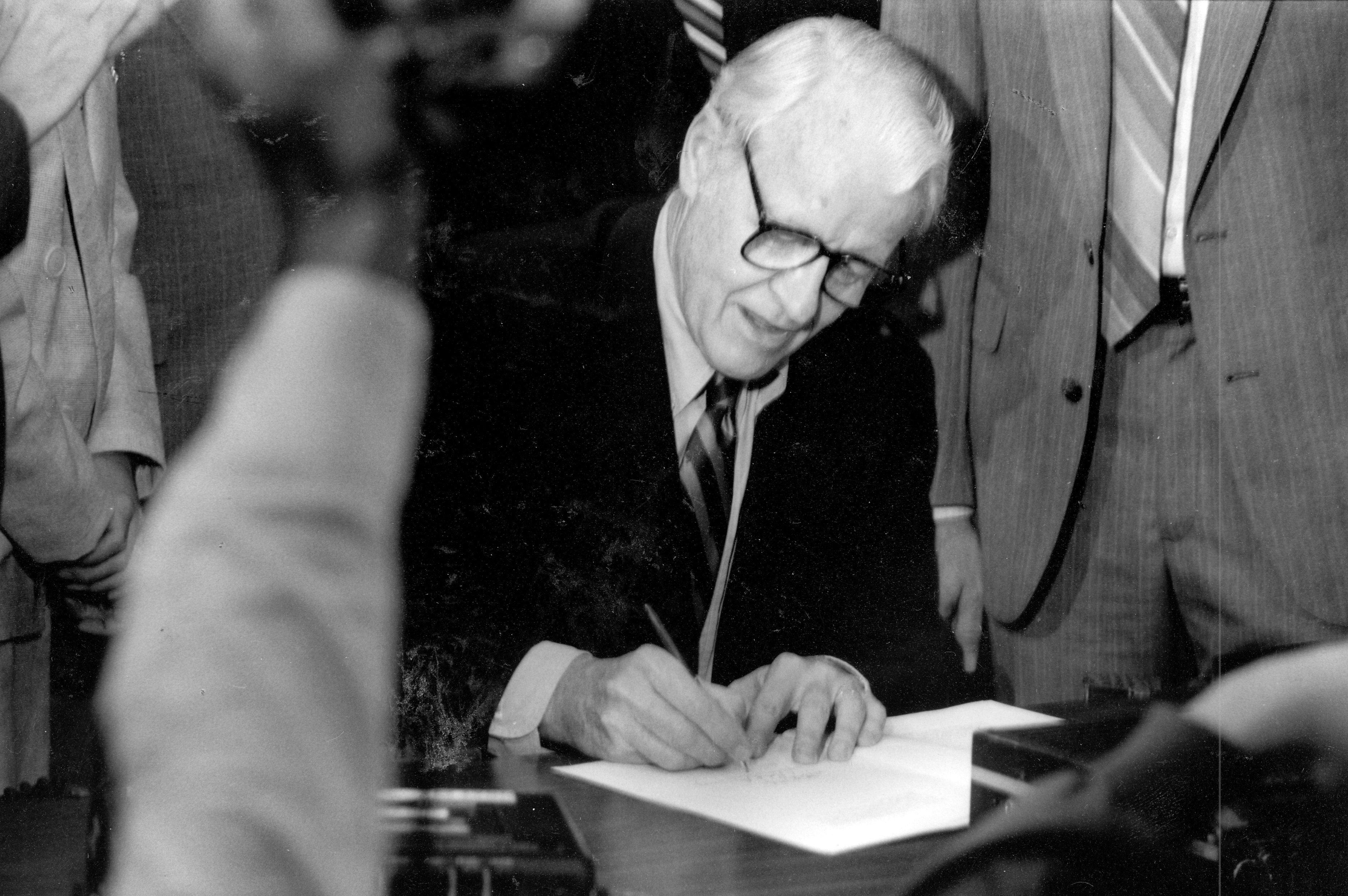 Officially, “the University of Southern Indiana was created at 12:07:15 p.m. on April 16, 1985, when Governor Robert D. Orr …signed the bill establishing the University of Southern Indiana before an audience of more than 1,500 people in the Physical Activities Center.”iv At the ceremony he said,