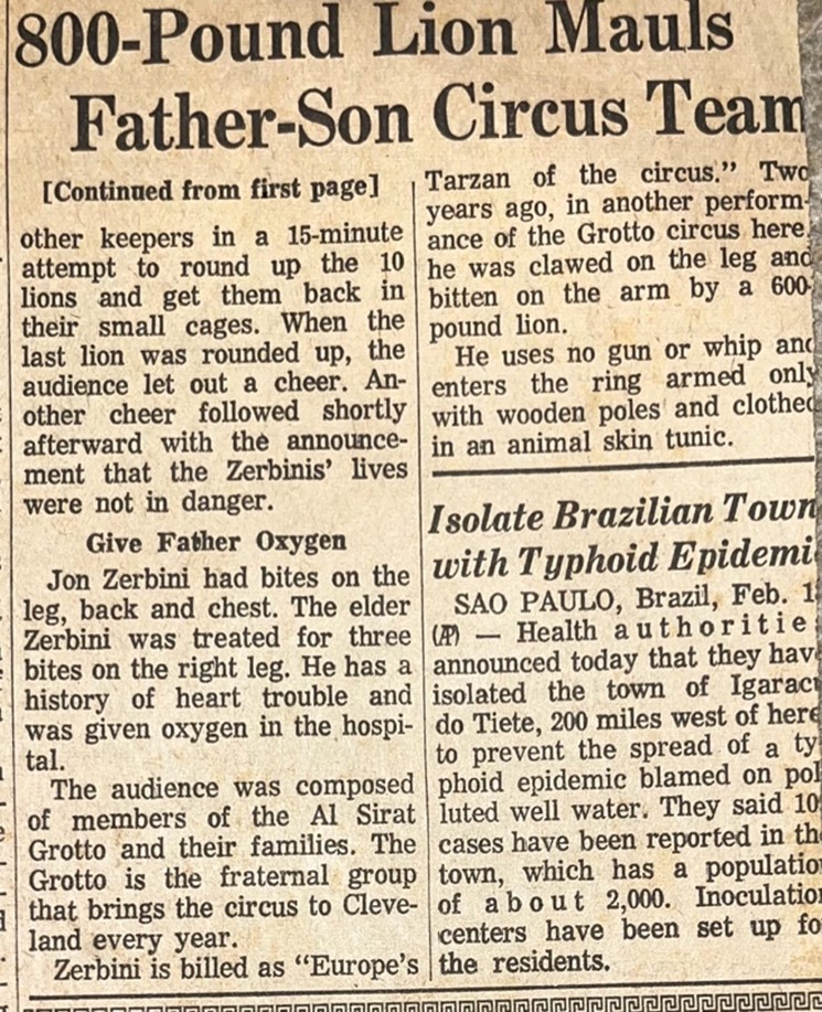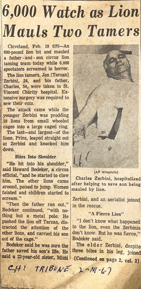 [5] “800-Pound Lion Mauls Father-Son Circus Team,” The Chicago Tribune (Chicago, IL), Feb. 19, 1967.