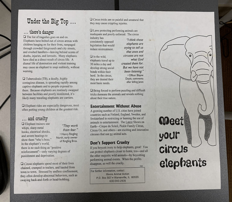 Meet your circus elephants: abused, neglected, sick, and ready to put on a show! Despite the fact that for nearly a century, elephants had been a star attraction of the circus, their inclusion in the circus was not without controversy. The brochure titled “Meet Your Circus Elephants” gives information about the abuses the elephants endured while being members of the circus. The brochure shifts focus to the livelihood of elephants in the wild, and how circuses should ban the use of elephants in the entertainment industry. The artifact includes a quote from Henry Ringling, an early owner of Ringling Bros., stating, “They work from fear.” Publicized quotes and stories claiming abuse of animals, like the elephant, in the circus turned the once mesmerized public against the unethical use of animals for entertainment.