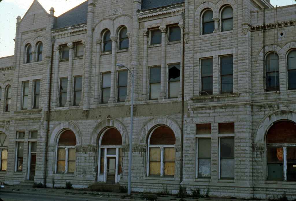 In 1965 this facility was razed for the construction of downtown Evansville’s Civic Center complex. But all was not lost! The image below is a close up of the columns, cropped from MSS 228-0178, The Sonny Brown Collection. It dates to 1960.