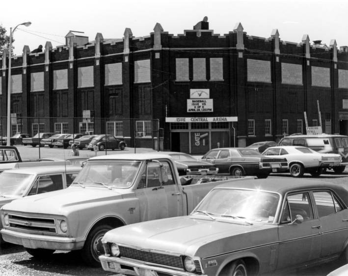 Demolition process. MSS 181-0800, the Darrel Bigham Collection Demolition process. MSS 181-0805, the Darrel Bigham CollectionThis gymnasium, built in 1927, was not demolished at the time the rest of Central High School was. At the time of this photograph, (1977), ISUE was Indiana State University Evansville, a branch campus of Indiana State University, which opened in 1965. Before the current campus was built, classes were held in an old school on 12th Ave. The first buildings on the current USI campus were built in 1969, but there was no gymnasium, thus the continuing need to use this building. Since 1980, this building is no longer used by the university.At one time this gymnasium was used as part of the downtown YMCA, although that organization has moved to a different location. This gymnasium still stands, although it is unclear if it has a current use. MSS 183-059, the Brad Awe Collection