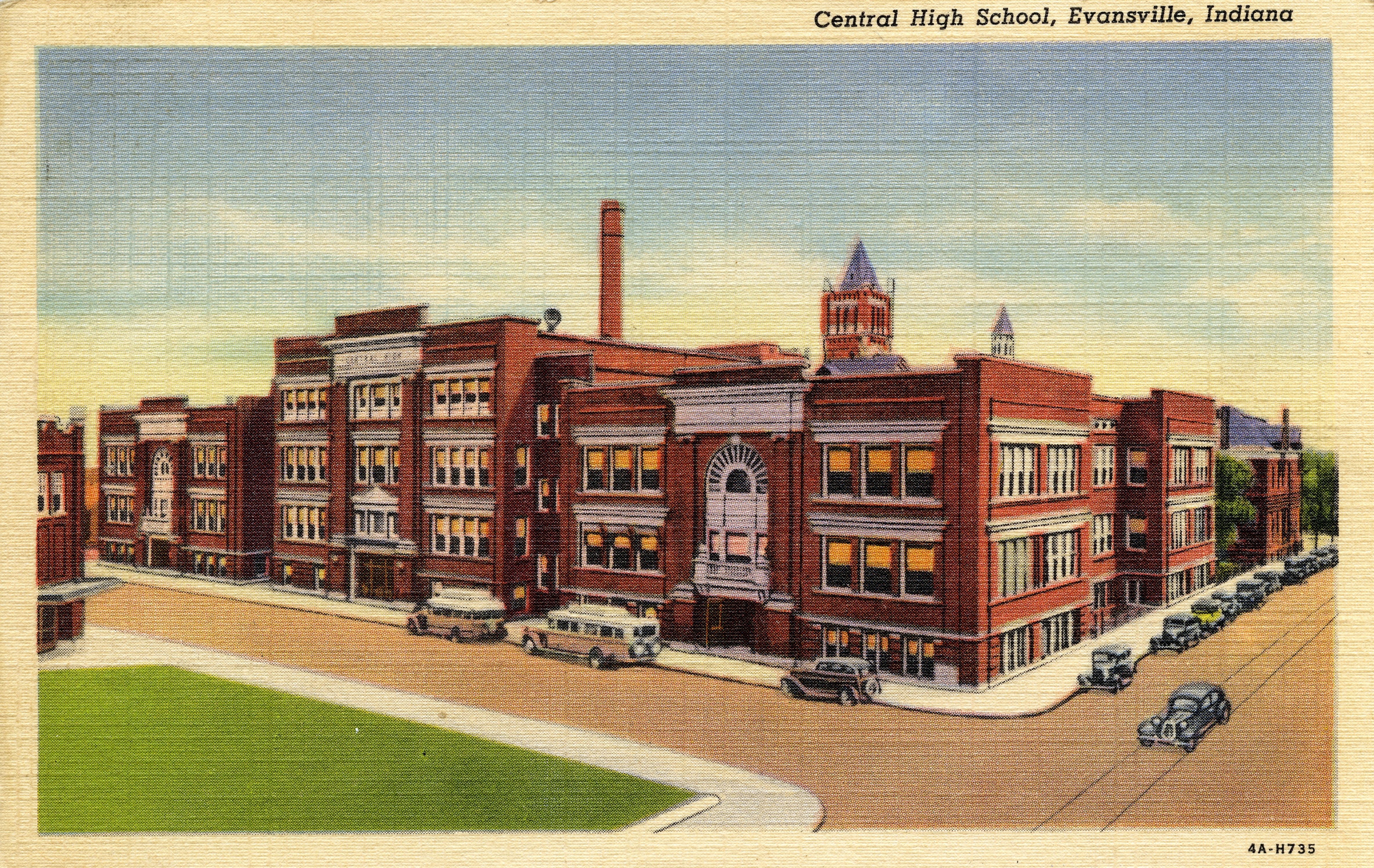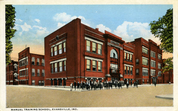 Drawing of Evansville High School at 203 NW 6th St. MSS 157-0450, the Schlamp-Meyer CollectionThis photograph dates to 1901. MSS 184-0886, the Brad Awe CollectionCirca 1910. RH 033-0532, the Evansville Postcard CollectionFront view, undated photo. MSS 157-0451, the Schlamp-Meyer CollectionManual Training School at 215 NW 6th St., formerly 2-6 Upper 6th St. Built in 1903, it became incorporated into the old Central High School that stood next door. It was razed in 1973 along with that facility. RH 033-546, the Evansville Postcard CollectionCirca 1918. RH 033-0540, the Evansville Postcard Collection