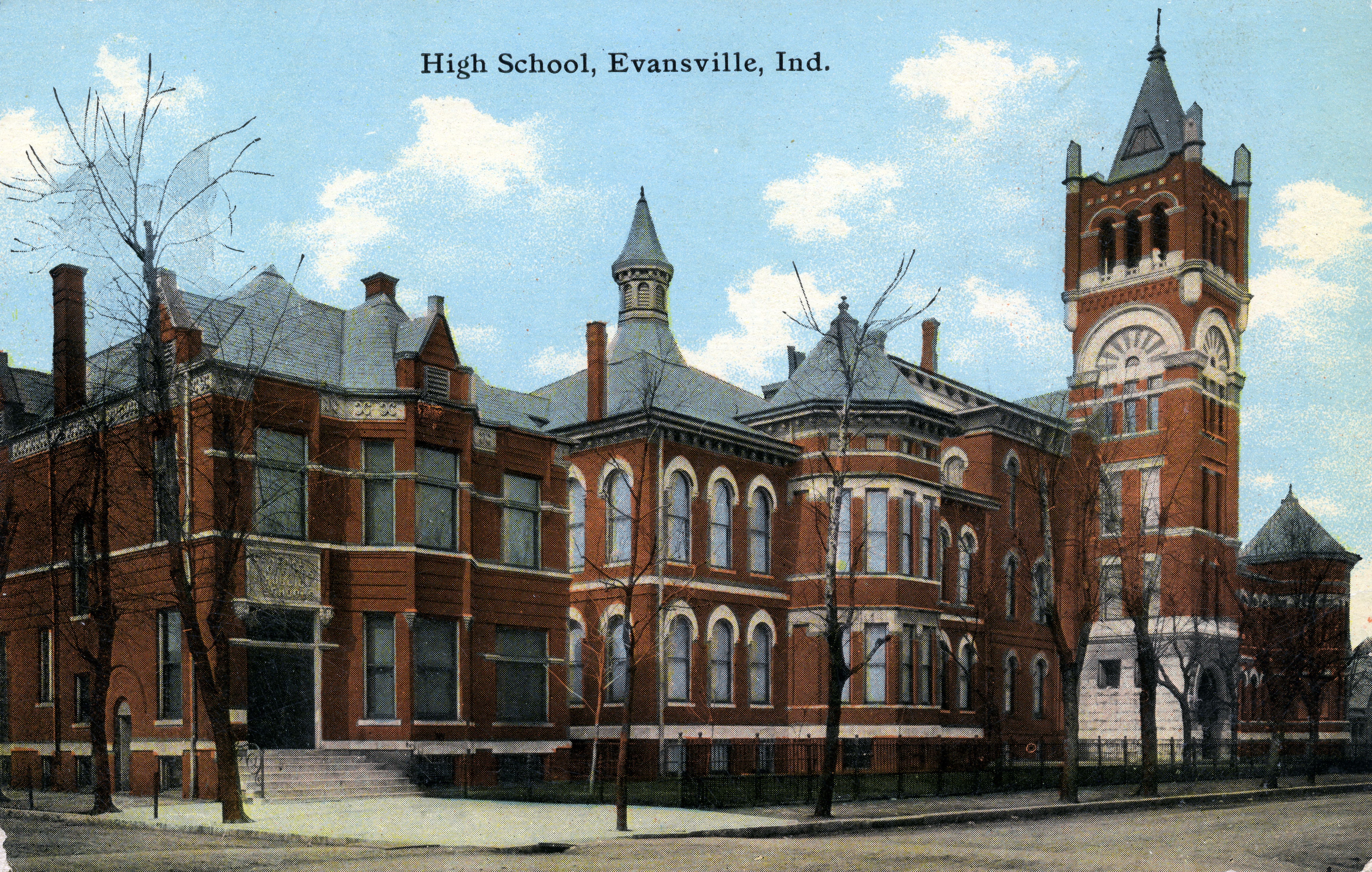 Education in the early days of Evansville was a private affair–private schools and academies for those who could afford to send their children there. In 1852 the Indiana legislature passed an act that provided for free, public schooling. By 1854 public schools were available in Evansville, with early classes being held in other available facilities. “In 1868 the splendid new Evansville High School building was completed on Seventh Street. Three stories in height, it contained six classrooms, a study hall, an auditorium, lunchrooms, and central heating. (However, there were no indoor toilets in the building until 1894.)” This was probably the first free public high school west of the Allegheny Mountains. (quotation from p. 43 of McCutchan, Kenneth P. et al. Evansville at the bend in the river: an illustrated history. Sun Valley, CA: American Historical Press, c2004. General Collection F534.E9 M38 2004)