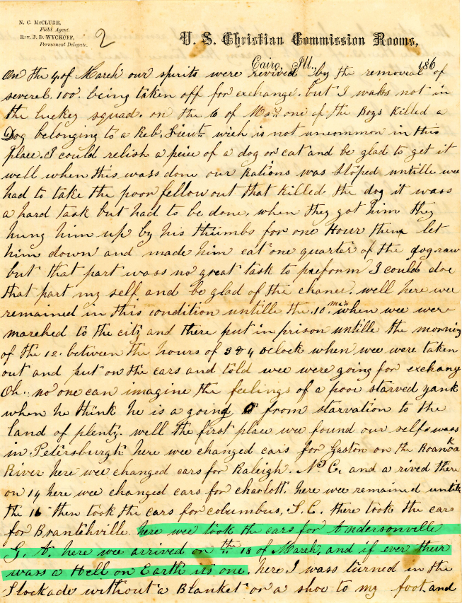 There was some talk of prisoner exchange but Horan was not included, so the march continued until March 18 when he arrived at Andersonville Prison. He wrote, “If ever their was a hell on Earth its one. Here I was turned in the stockade without a blanket or a shoe to my foot and the skies above for my shelter and I remained in this condition untill the 13 of Sept.”