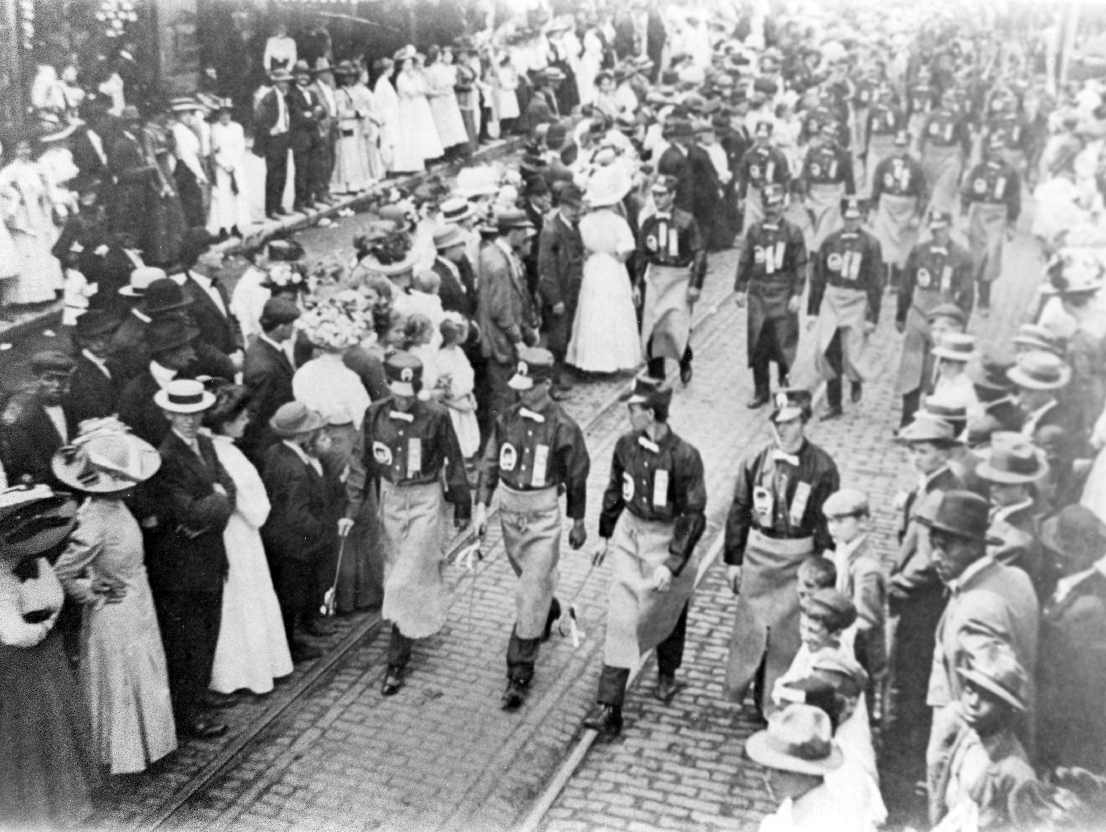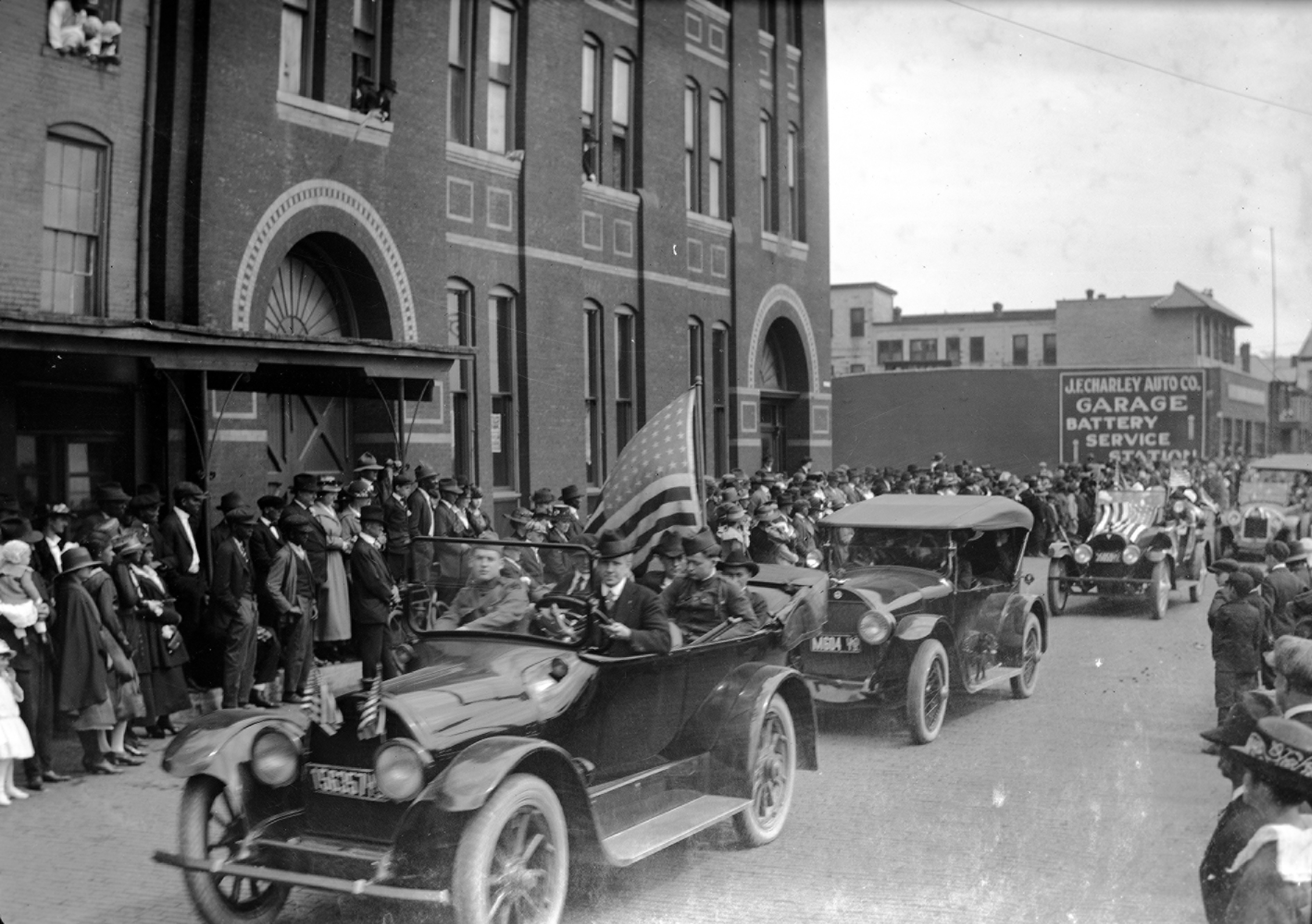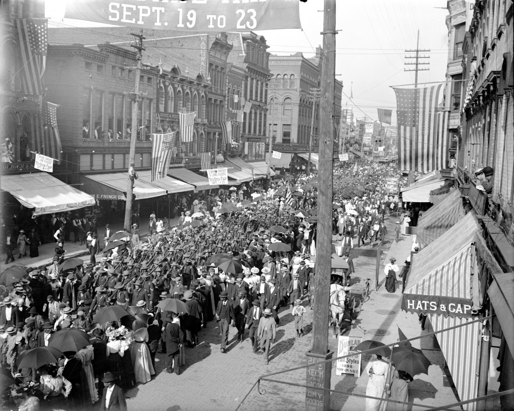 1893:German Day parade down N. Main St. near Iowa St. German Day was organized by the city’s German elite around 1890 to celebrate German cultural, intellectual, and technological achievements. After the 4th of July, this was the most prominent civic celebration each year until WWI ended it. Germania Maennerchor’s Volksfest is a reminder of those times. RH 033-03401898: Crowds on Main St., around trolley tracks, watching a parade celebrating end of the Spanish-American War. The armistice was signed August 12, 1898. MSS 264-29551909: Local 110 of the Horseshoers Union marched in a Labor Day parade on September 2, 1909. MSS 181-00281917: Nurses in Red Cross parade on Main St., just past the intersection with 2nd St. MSS 288-19921917: Red Cross ambulance in 1917 parade, probably on Court St MSS 288-1985Circa 1917: African American nurses and children marching in World War I parade near old courthouse. They are just going past the Market St. side of the Soldiers and Sailors Memorial Coliseum, the front of which is at 300 Court St. MSS 288-1964April 7, 1918: “Evansville Boys at Home” in World War I parade on Main St. MSS 288-1965Circa 1918: War Mothers organization on Main St., just past 2nd St. The American War Mothers organization was founded in 1917 to support mothers who had a child enlisted in the military during WWI. This later extended to other wars; the group continues todayalbeit with waning membership. MSS 288-2137April 19, 1919: 5th Liberty Loan campaign parade on Riverside Dr.The Liberty Loan program was created by Secretary of the Treasury and head of the Federal Reserve, William G. McAdoo, to fund the war. MSS 288-1947 September 1920: Labor Day parade on Main St., with Teamsters Local 29 from the Sunnyside Coal Co. MSS 181-03021939: WPA Christmas Parade figures.This is probably taken at the Municipal Market at 813 Pennsylvania St., side entrance at 814 W. Indiana St. (not sure which side shown)WPA was the Works Projects Administration (earlier the Works Progress Administration, a New Deal program for the unemployed during the Depression. MSS 264-02641939: crowd watching the WPA Parade. MSS 264-0273September 1958: Float in Warrick County Home Demonstration Club Council parade, showing 102 years of progress, from 1856-1958, with women on the left doing laundry with a washboard and tub near a coal stove, and moving on to Westinghouse appliances. MSS 264-0090MSS 157-0290