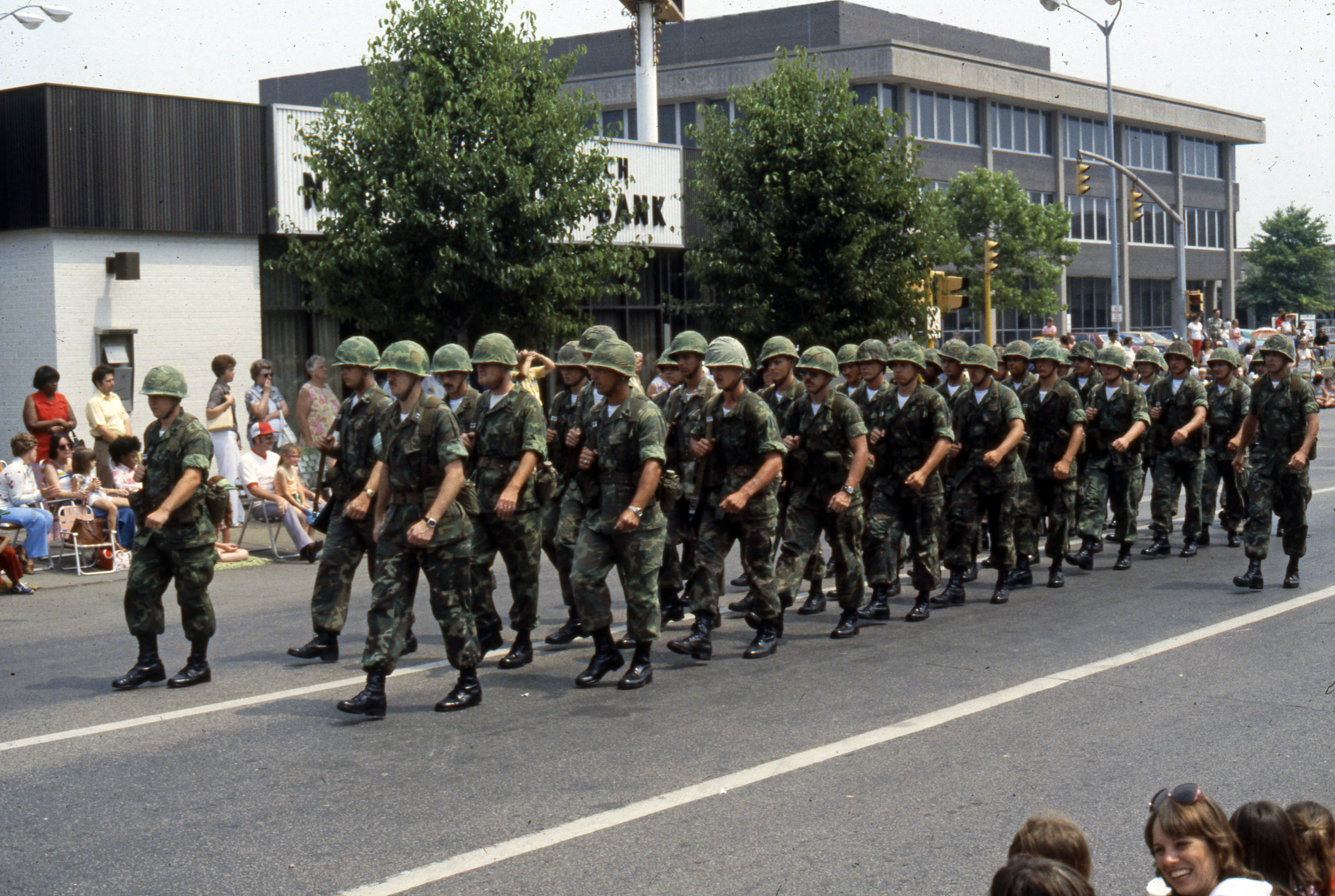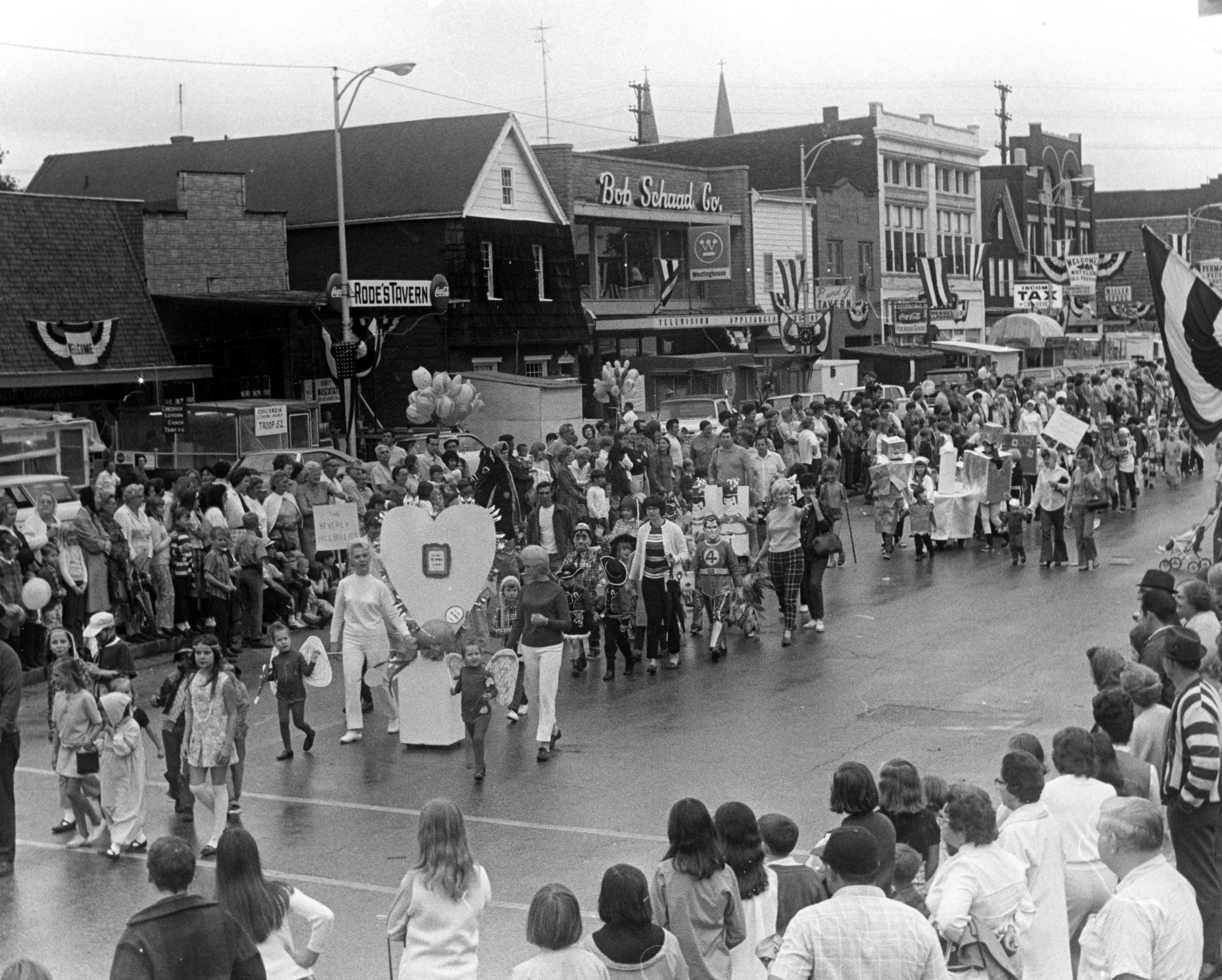 MSS 157-1014Circa 1970: Army troop on parade down Martin Luther King, Jr. Blvd., just past the intersection with Vine St. MSS 157-2574June 28, 1975: Colonel Sanders sitting on the back of a sports car in Freedom Festival Parade. MSS 034-0041Circa October 1975: Children in Nut Club Fall Festival parade on W. Franklin St., in the 2200 block. The food booths can be seen behind the crowds. Begun in 1921 by a group of West side businessmen calling themselves the Nut Club, the event has evolved to be one of the largest St. festivals in the United States. During the first full week in October, 4 blocks of W. Franklin St. are closed to all but pedestrian traffic. Non-profit organizations have booths that line both sides of the St. and sell all sorts of food. Parades and entertainment are also included. The Nut Club donates its profits to worthy causes in the community, and the non-profits that have booths are able to fund many of their activities due to the monies raised. MSS 181-0658