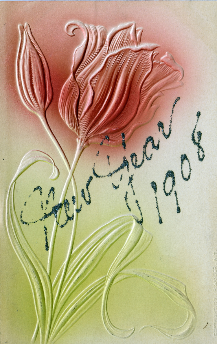 The glitter seen on this last postcard is a common decoration on vintage postcards. This one dates to 1908. The back of the card says From E. Welcker, but it was never mailed.