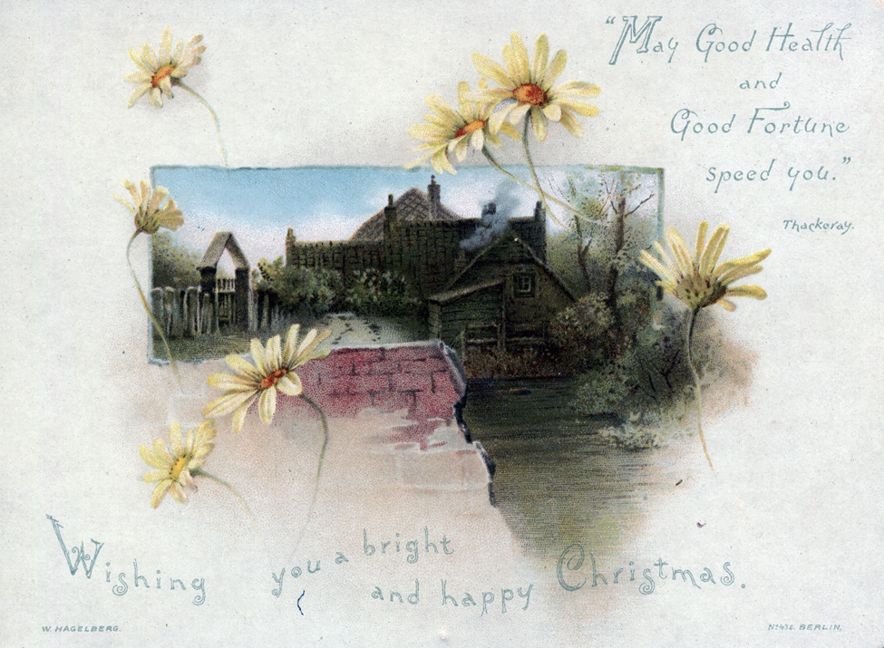 This first postcard is not dated, but it is unique in the use of daisies, a flower not commonly associated with winter and/or Christmas.