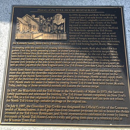 Ruth Wakefield died in 1977. The inn burned down in 1984 and was not rebuilt. All that remains today is this commemorative sign. There’s a Wendy’s restaurant there now.
