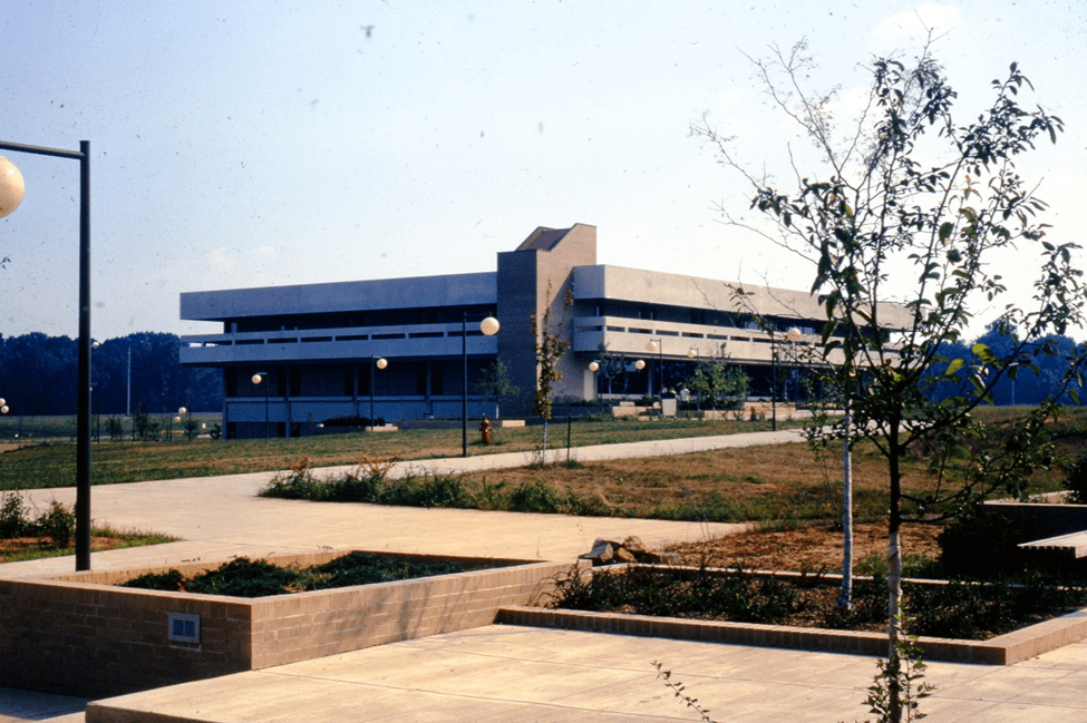Here’s a 1972 view of front of the former library building, taken from a campus view. You can see some of those straight sides and overhangs mentioned above more clearly here. Much of the surrounding area was developed and remains today in a way that you might recognize, but that development occurred after this photograph was taken.