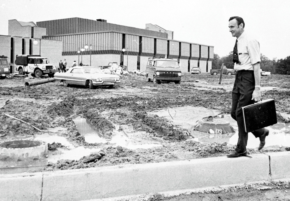 First, just a quick history for anyone not familiar with the history of the University of Southern Indiana. Way back in 1965 we started as a regional campus of Indiana State University, thus called Indiana State University Evansville, or ISUE. There was no campus as we know it today; early classes were held in an old (built in 1876) building at 112 N.12th Ave. called Centennial School. Fast forward to 1968, with the campus under construction. Here’s an image of the first president, Dr. David L. Rice, walking by a muddy field to his office.