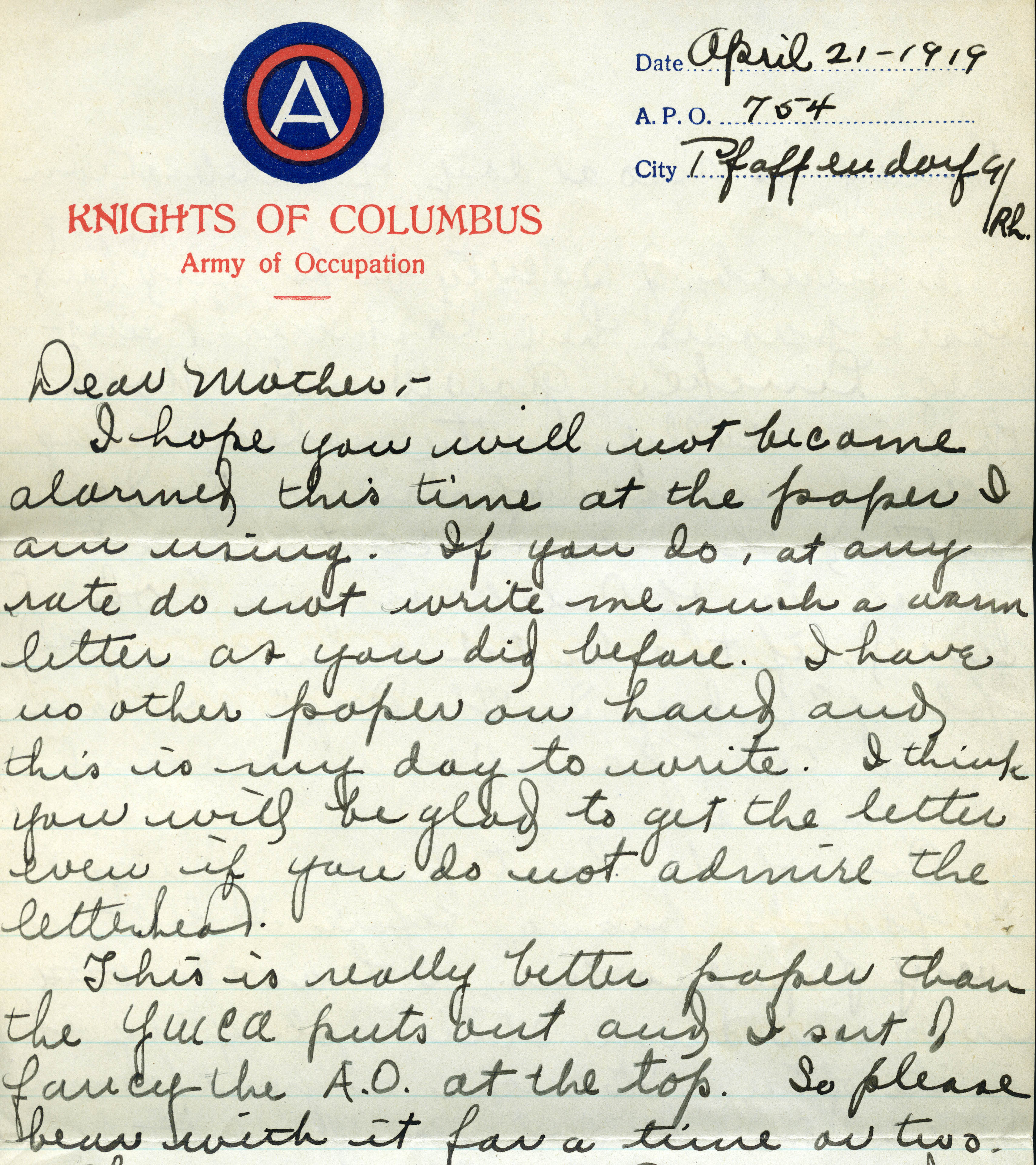 But then a letter from Vernon appeared in his mother’s mailbox, written on the letterhead seen below. From the content below you can see that stationary provided by the Knights of Columbus was cause for comment, a fact he addresses by saying that he feels she ought to be glad for any letter, no matter the stationary.
