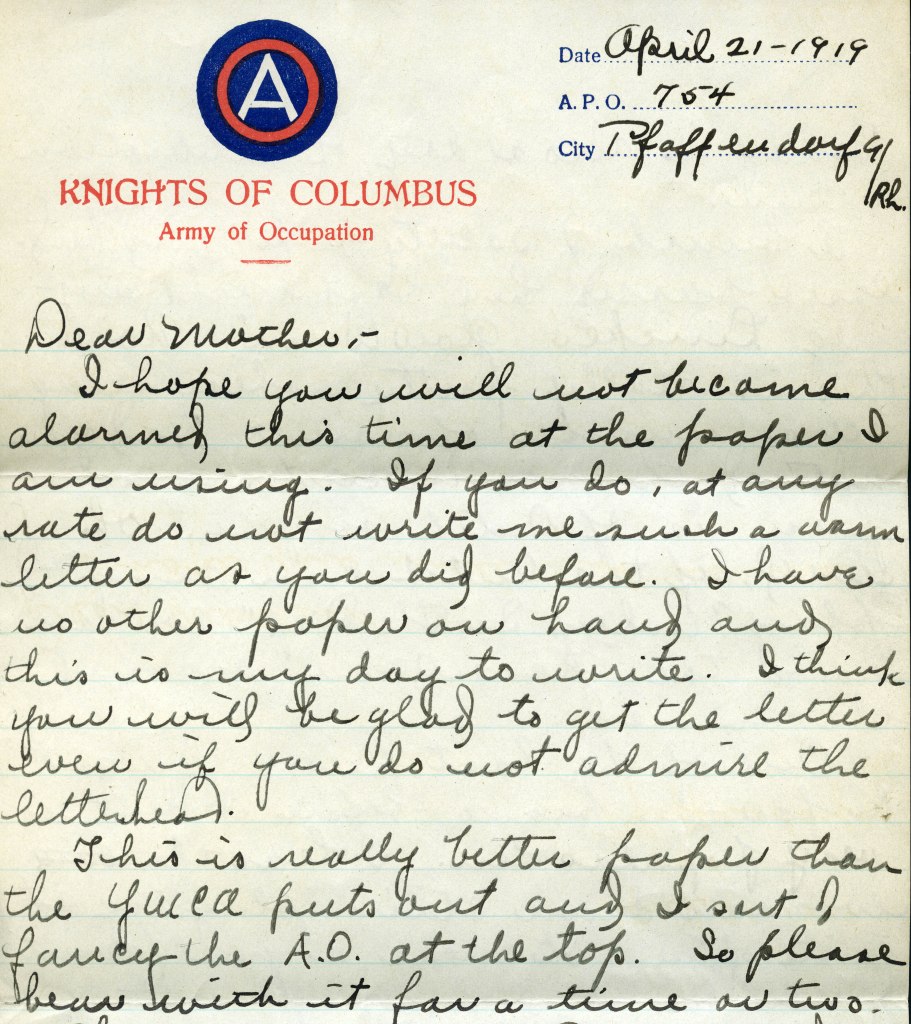 On August 8 he says that he’s on the lookout for souvenirs. “One of the cooks gave a German prisoner a sack of tobacco for an Iron Cross.” Later letters indicate that he came to rue this statement! On October 30 he writes, “I wrote to the people you refer to chiefly because you insisted upon it. Really I hope they do not answer because I am not over fond of writing under the present handicap. Everyone I write to wants a souvenir and I don’t think you ever fail to remind me of that German helmet. New souvenirs do not grow on trees, and, even if they did, they would be very scarce because there are very few of them. I can’t send you the medal I spoke of at present. I can’t send you a German helmet now for several reasons….” March 30, 1919: “No, I am not going to lug home souvenirs to other people.” By this time he has a collection of souvenirs but is reluctant to mail them home, fearing they will get lost. “Any person of intelligence will appreciate what I have. As for others, I don’t care.” Clearly, the souvenir issue was a sore spot. On May 4, 1919 he writes to his mother, “It is surprising how I have picked up correspondents since I have been in Germany, I is also surprising how they all have the same trend….souvenirs. I think it is a little too much for people to write to me now and ask for souvenirs. Do they really think I am going to cut my meager income in order to supply them with souvenirs. If so, they are badly mistaken.”