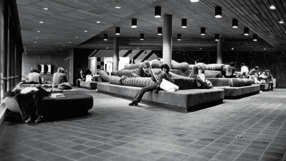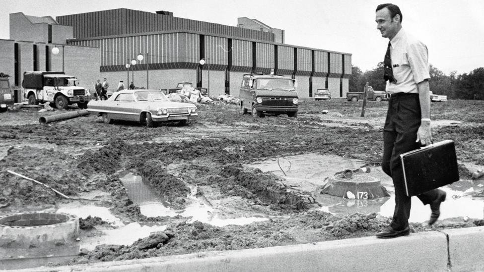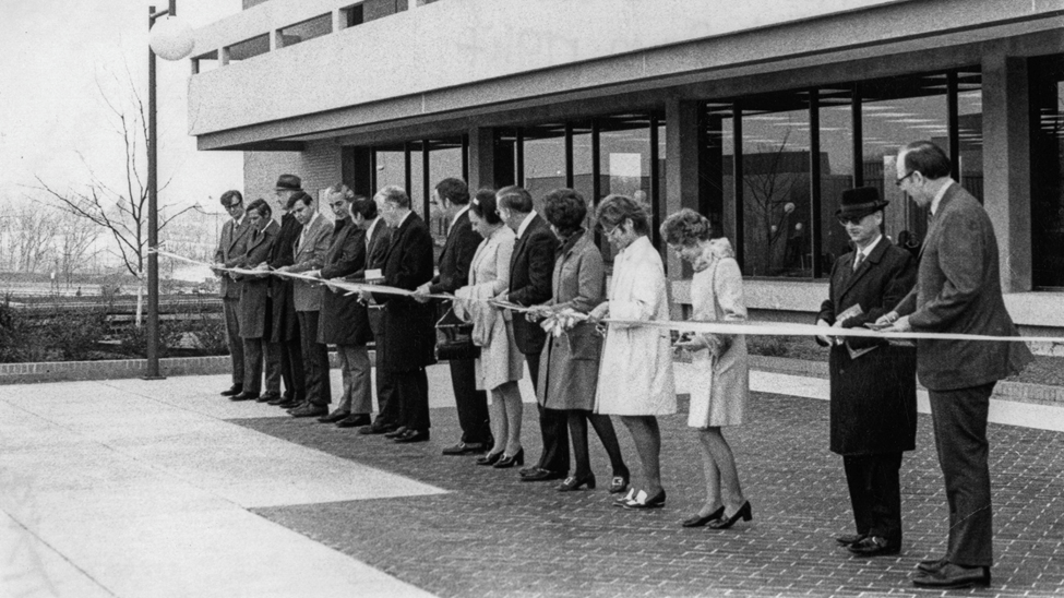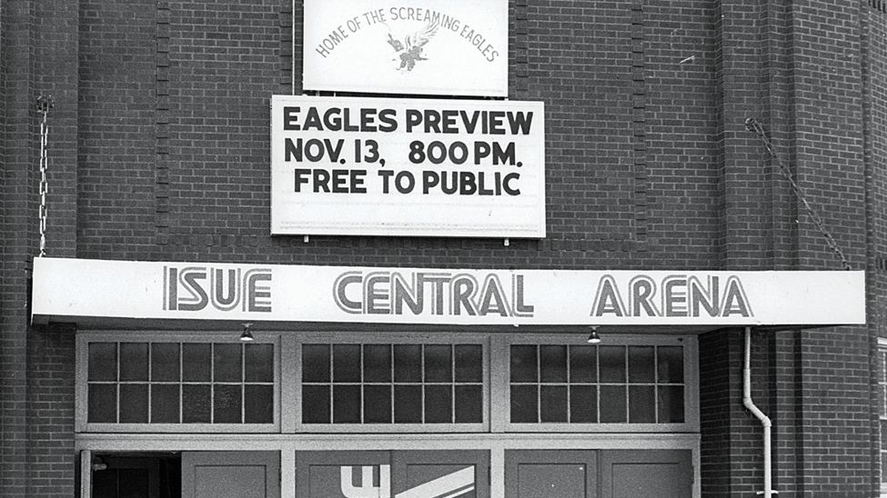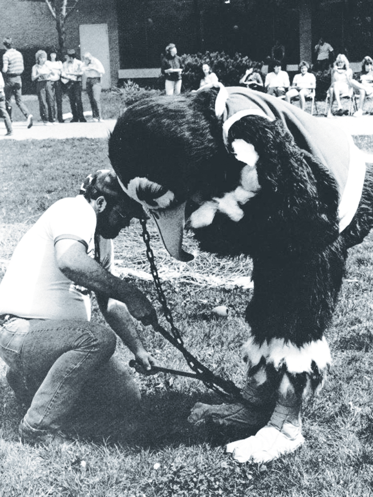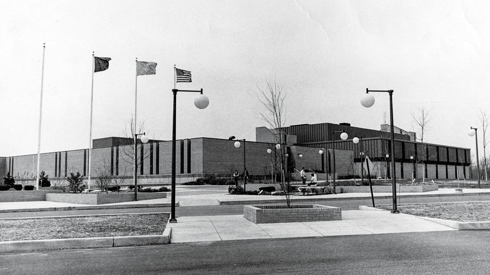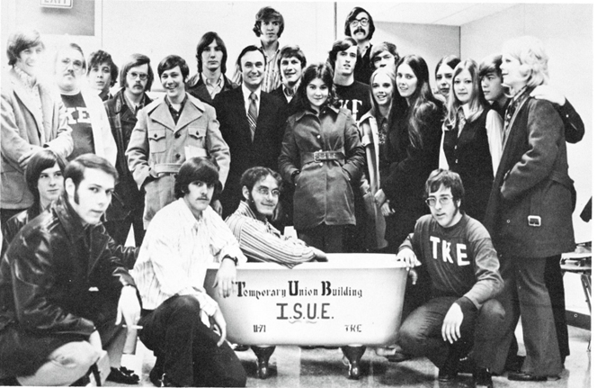 This is Centennial School at 112 N 12th Ave., built in 1876. When the dream of having a public university in Evansville was first realized back in 1965, the first classes were held here. As you can well imagine, the 89 year old building had seen better days. (UA 011 USI 50th Anniversary, 50 poster)This 1965 glimpse into a Centennial School classroom gives you an idea just how (literally) “old school” it was. (UA 011 USI 50th Anniversary, 50 poster)This is the student newspaper at the time. Given the age of the building where classes were being held, perhaps you can understand why this name was chosen for the student newspaper!Don’t misunderstand me—ISUE backers were glad to find a place to hold classes, but this certainly highlighted the need to build a campus for ourselves. (UA 011 USI 50th Anniversary, 50 poster)This 1968 photograph shows construction of the campus well underway. The man carefully avoiding the mud puddles is Dr. David L. Rice, first president of our campus, and the one for whom our library is named. (UA 011 USI 50th Anniversary, 50 poster)This view of Mid-America Plaza shows a number of buildings in place. The photograph is undated, but cannot be later than the early 1970s. (UA 011 USI 50th Anniversary, 50 poster)Clearly the priority for initial construction had to be academic spaces, but sports fans cannot be denied. Until a facility was built on campus (1980), the Screaming Eagles of ISUE played in this building. This was built in 1929 as the gymnasium for Central High School, at the corner of Court and NW 6th Streets. History note: Central High School moved to its current location on First Ave. in 1971. (UA 011 USI 50th Anniversary, 50 poster)1975 ISUE women’s basketball team. (UA 011 USI 50th Anniversary, 50 poster)This 1971 photograph shows a ribbon cutting for the first library building on campus. NOTE: Although this no longer serves as a library, the portion of the building seen here still can be identified as part of the University Center East. (UA 011 USI 50th Anniversary, 50 poster)This colorful image is the front lawn of the contemporary library, with some “added color.”This photograph is not dated, but it has to be after the 2006 opening of the library. (UA 011 USI 50th Anniversary, 50 poster)Speaking of the University Center, the original union building was to be temporary, or T.U.B. Here are Dr, Rice and members of TKE with a real tub! (UA 011 USI 50th Anniversary, 50 poster)This 1974 photograph shows the interior of the early University Center. (UA 011 USI 50th Anniversary, 50 poster)One final image, here to explain why you’re attending USI and not ISUE. This 1985 image shows Archie being “freed” from his tether to ISU. 2025 represents 40 years as USI. (UA 011 USI 50th Anniversary, 50 poster)