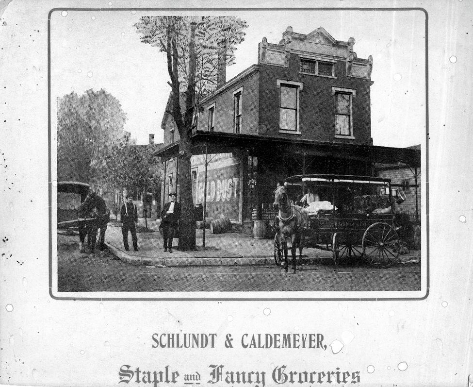 The Schlundt and Caldemeyer Staple and Fancy Groceries business operated between 1905-1925, and was located at 700 3rd Ave. in Evansville, IN. Edward J. Schlundt and Daniel H. Caldemeyer were half -brothers who later owned a furniture business together. Signage indicates that Gold Dust Flour and Lipton Tea were 2 of the products available. Note again the delivery vehicles. This building is no longer standing.