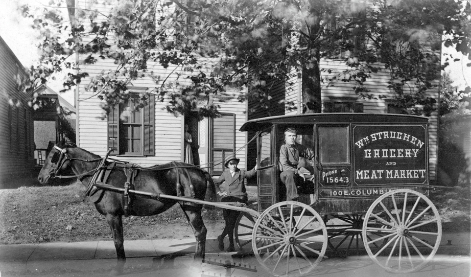 This undated image does not show a grocery store, but rather the delivery wagon for William Struchen Grocery and Meat Market, itself located at 100 E. Columbia St. in Evansville, IN. Here the driver and his young assistant are preparing to delivery groceries to the house in the background. Where this house is/was in Evansville is unknown, but you can clearly see a woman standing in the doorway, awaiting her groceries.