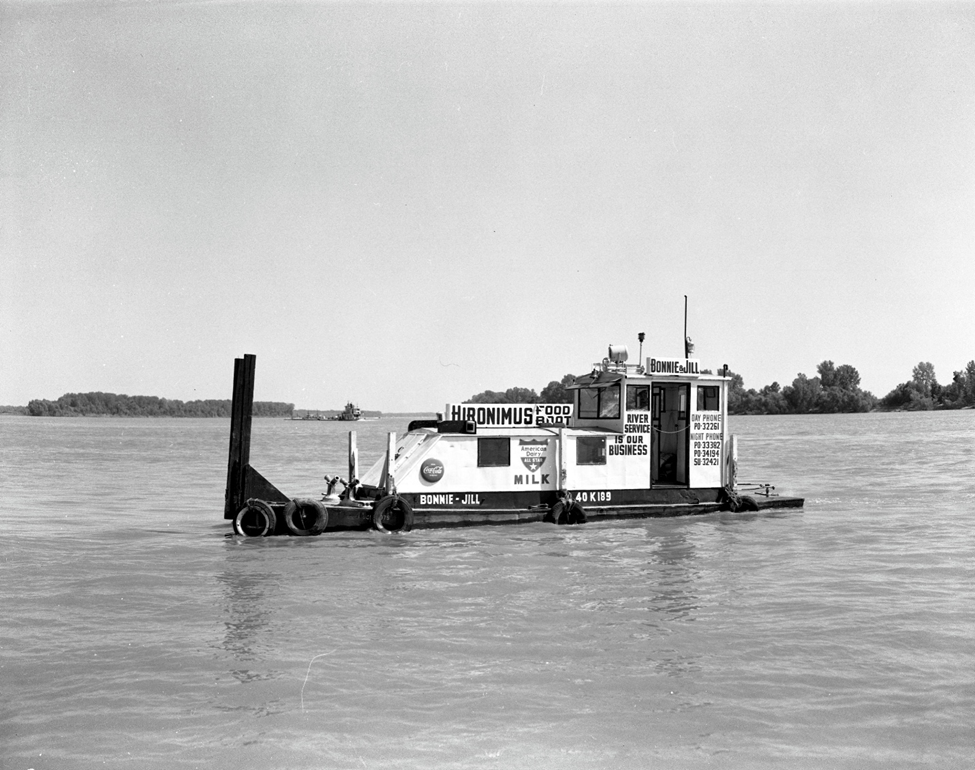 Not everyone lives in a house on land where groceries can be easily delivered! This 1960s photograph shows waterborne delivery of groceries to boat captains pushing barges on the Ohio River. The captain would call in their needs to the Hironimus Food Center on W. 3rd St. in Mt. Vernon, Indiana, and would receive their orders from this vessel. The Oscar Hironimus family owned two of these boats, named after daughters Bonnie and Jill.