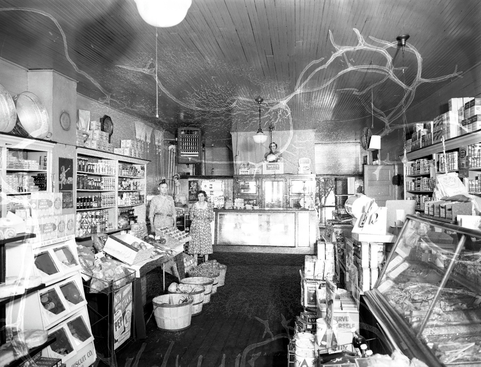 This July 25, 1939 image shows the inside of the Henry Wills’ Grocery at 501 N. Tekoppel Ave. in Evansville, IN. (There is no lightning in this store; this is a flaw in the original photograph.) This may be a bit more self-serve, but it’s clear that the clerks would still have to bring some items out to the customer. As of the July 2023 Google maps view, this building still stands but is a liquor store (corner of Tekoppel, Hogue, and Upper Mt. Vernon Rds.)