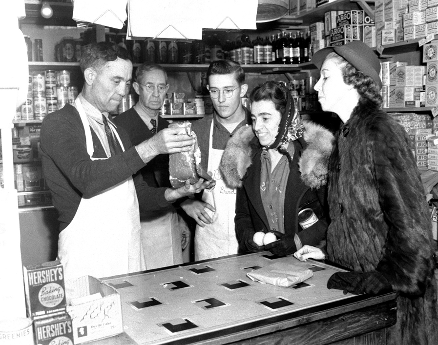 This 1941 photograph of a grocery in New Harmony shows a scene I’d certainly hope never to see, in terms of hygiene! Here the grocer and his assistants are showing two avid women a piece of raw meat.