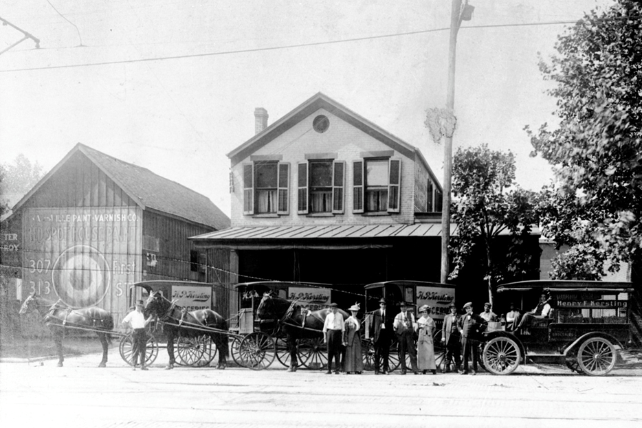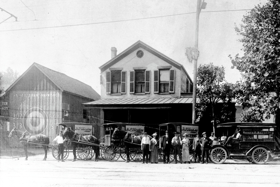 The above shows the grocery story owned by Henry P. Kersting, located at 121 W. Franklin St. (what would now be 1321-3 W Franklin St.) in Evansville, IN. The owners, Henry and Mamie, lived above the store. Note that there are 3 horse and buggy delivery vehicles and one automotive delivery vehicle parked out front. This is circa 1890. (This house was razed circa 1962.)