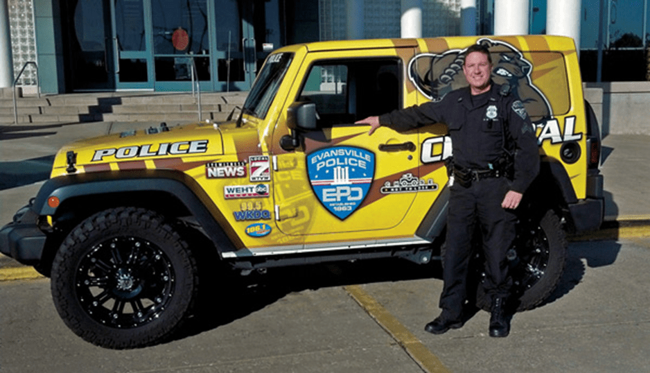 School resource officer Greg Brandenstein showcases Central High School’s vibrant Jeep Wrangler in front of the school in 2013. Image found here.