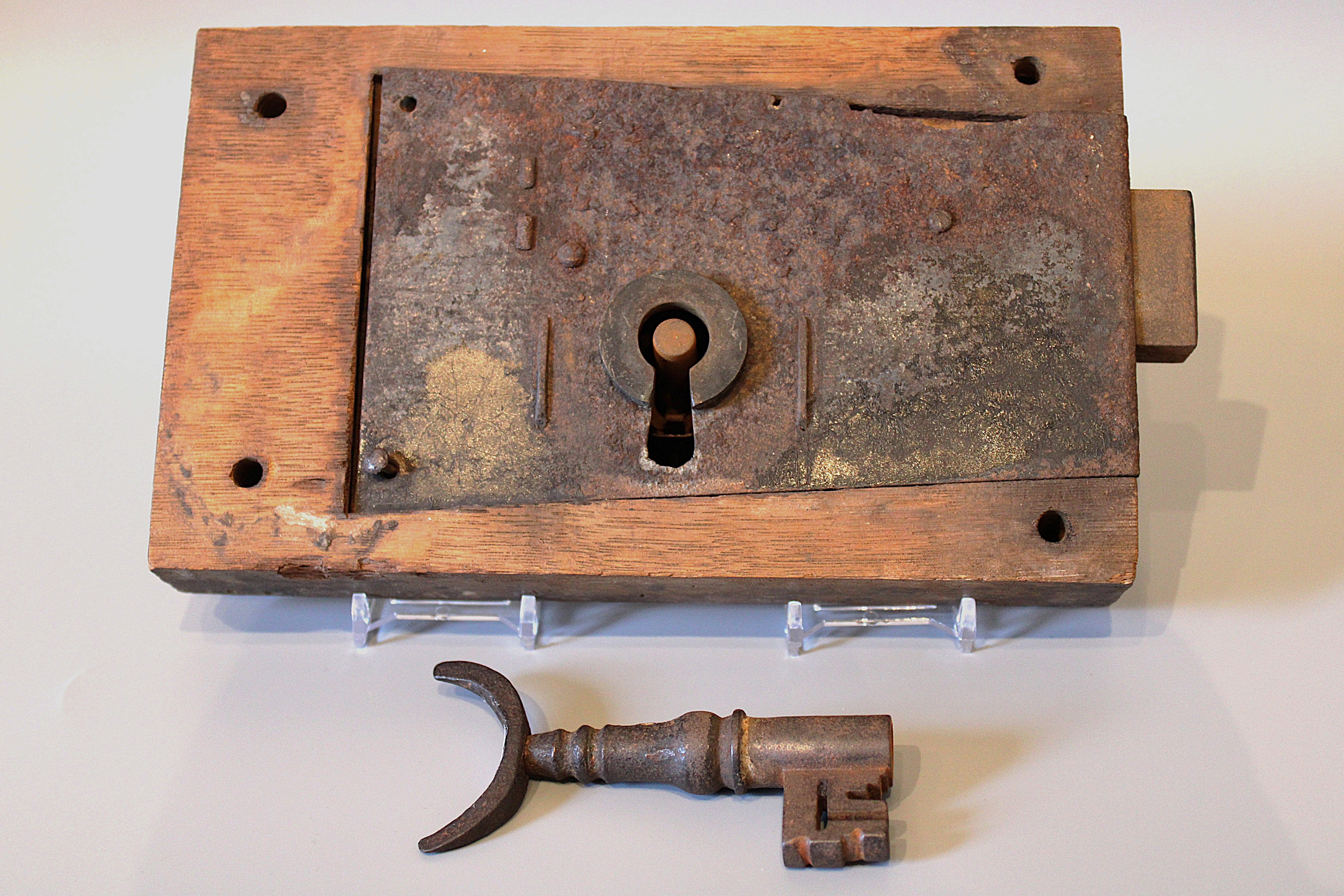 The first item is this wooden rim lock and key from John James Audubon’s saw and grist mill built in 1816 in downtown Henderson. Despite being over 200 years old, the lock and key still work today!