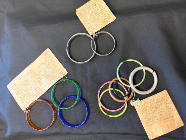 The second item is these caste bracelets from MSS 333, the Zion United Church of Christ (UCC) collection. Zion was the first Evangelical Lutheran Church in Evansville. It opened in 1849 and closed in 2025. The church buildings are being repurposed for a community center and housing. For many years the church had missionaries that served in India, and these bracelets were brought back as a reminder of their trips. Bracelets of glass or lacquer, of aluminum, of silver or gold, were put on for beauty, at marriage for signs of caste. The dark blue was worn by the Chamar, the brown by the Tali, and the green was from the Rout caste. The metal bracelets indicate a widow. She had to break her colorful bracelets and wear the plain metal to show her status as a widow, according to the notes attached to he jewelry.