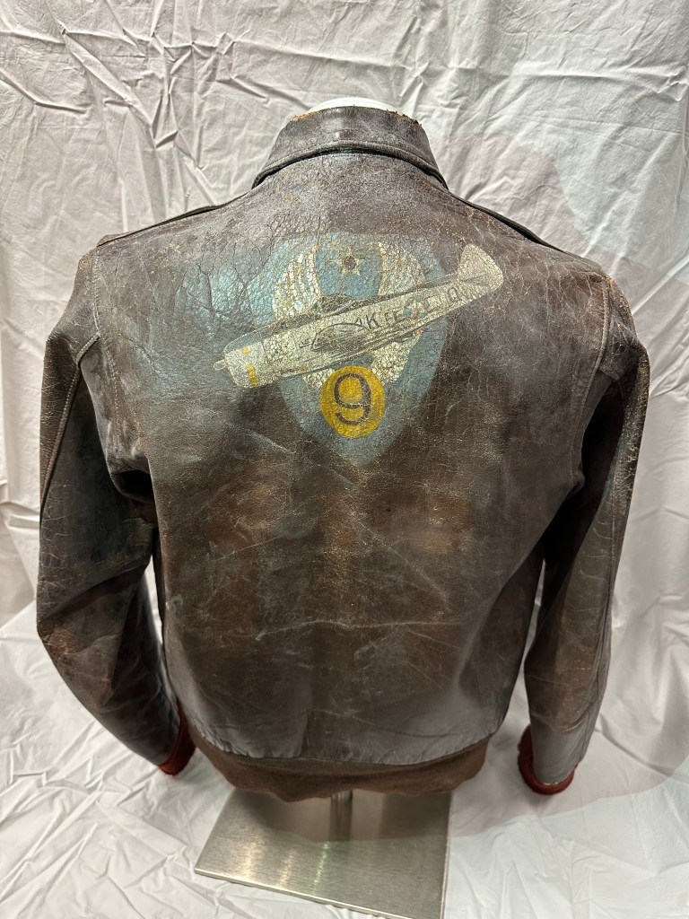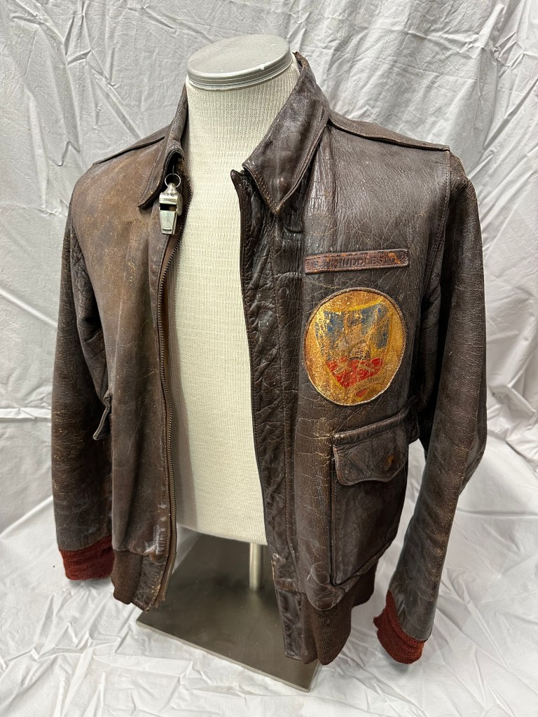The first item is this leather flight jacket that belonged to P-47 pilot Robert Huddleston, who flew in the European Theatre of Operation. Huddleston lives in North Carolina.