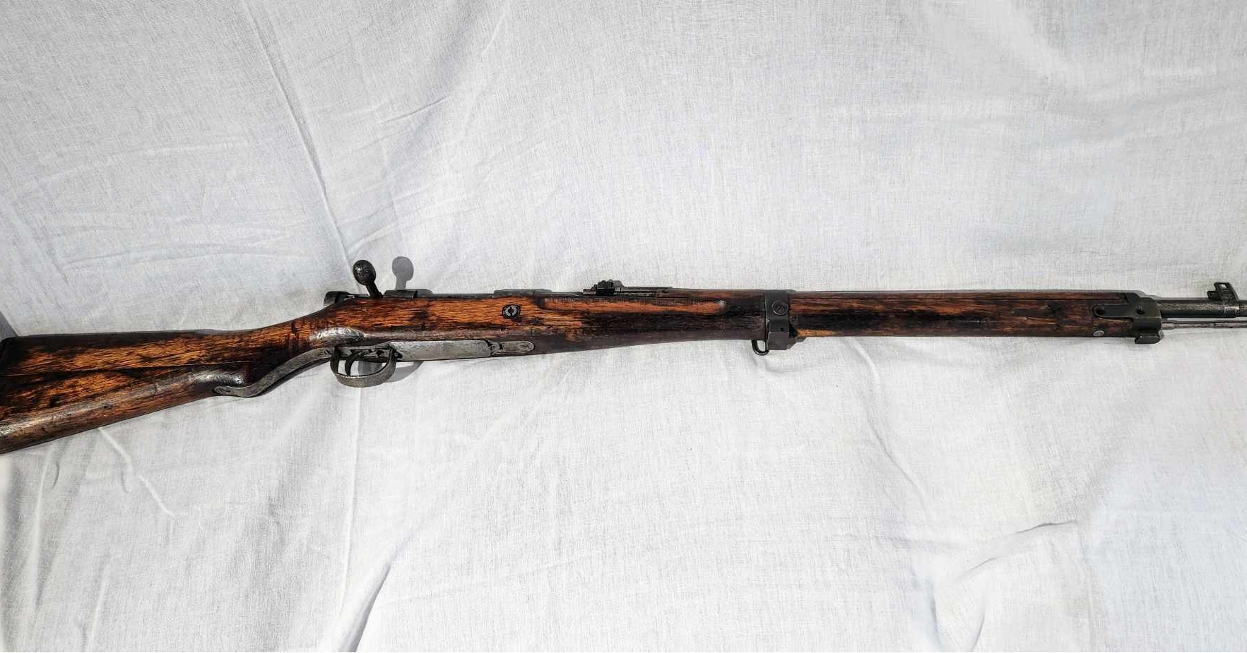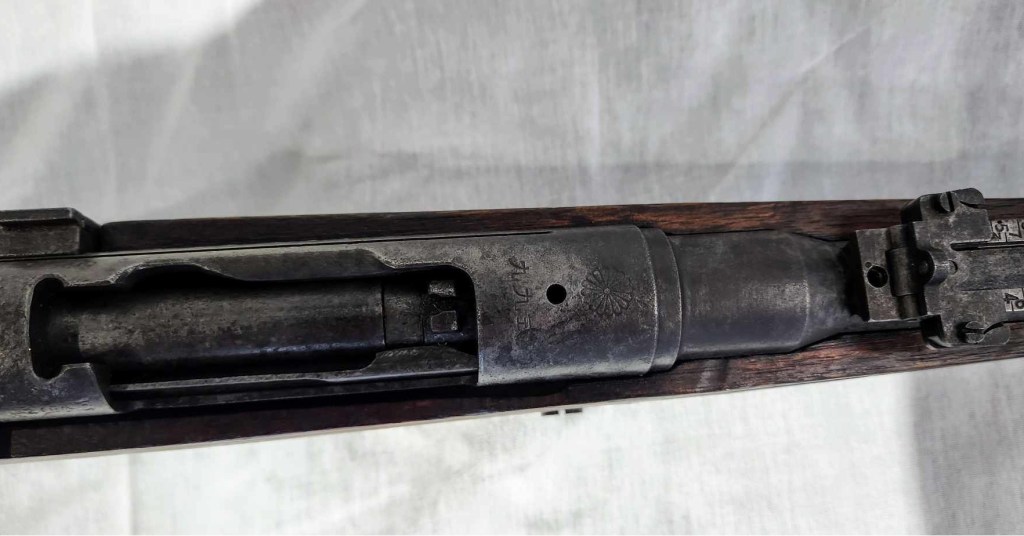 The first item is this Type 99 Arisaka Japanese rifle, taken straight from the beach at Iwo Jima, this still operational piece was the quintessential firearm of the Imperial Japanese Army in WWII. The chrysanthemum on the barrel not only signifies the royal family, but makes the piece very rare in collective value.