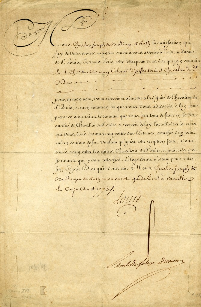 This 1775 letter signed by King Louis XVI of France is a military appointment for Charles Joseph Bullingen de Rath. Louis XVI (Louis Auguste) was born in 1754, married Marie Antoinette in 1770, became king in 1774, and was beheaded during the French Revolution in 1793.
