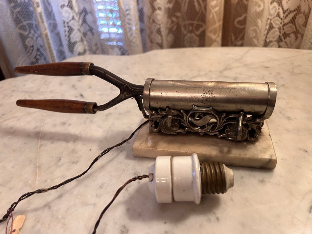 The second is this pre-1917 curling iron & heater: Created by the Simplex Electric HTG. Company, the curling iron heater would warm up by plugging the cord into a light bulb socket.