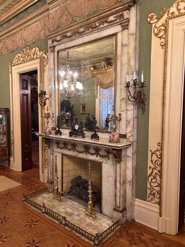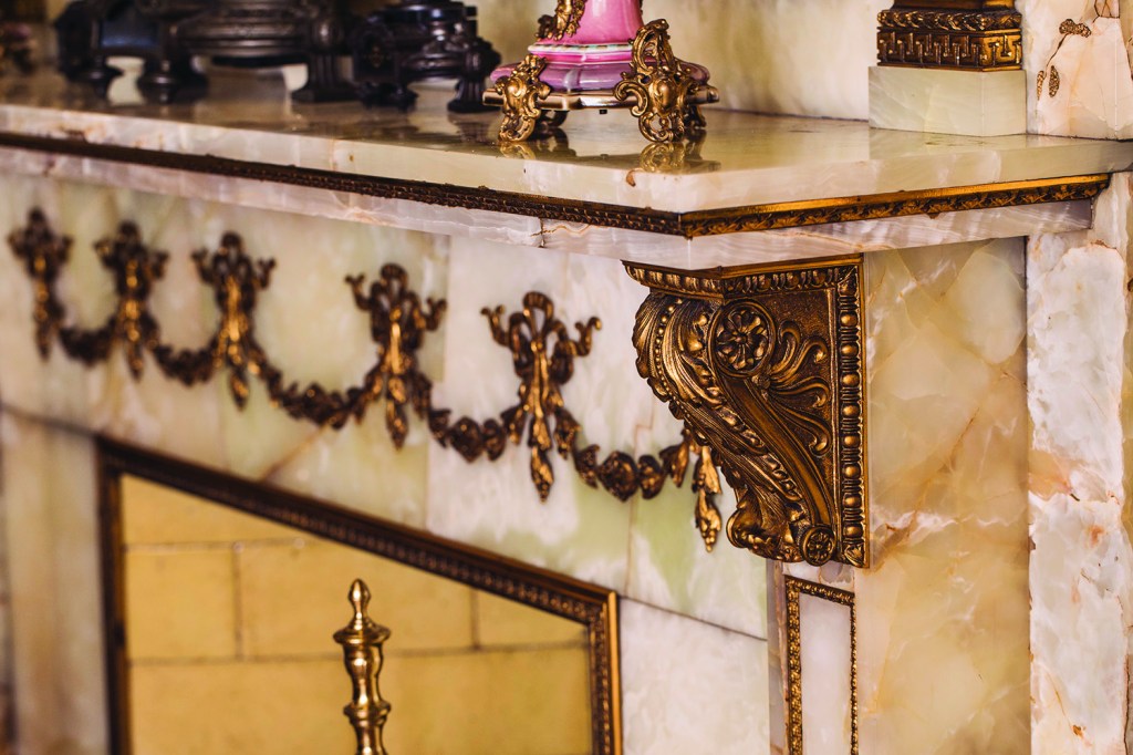 The first item is this Chicago World’s Fair Tiffany & Co. White Onyx Fireplace: Acquired at the World’s Columbian Exposition of 1893, this piece has been the highlight of the Drawing Room ever since.