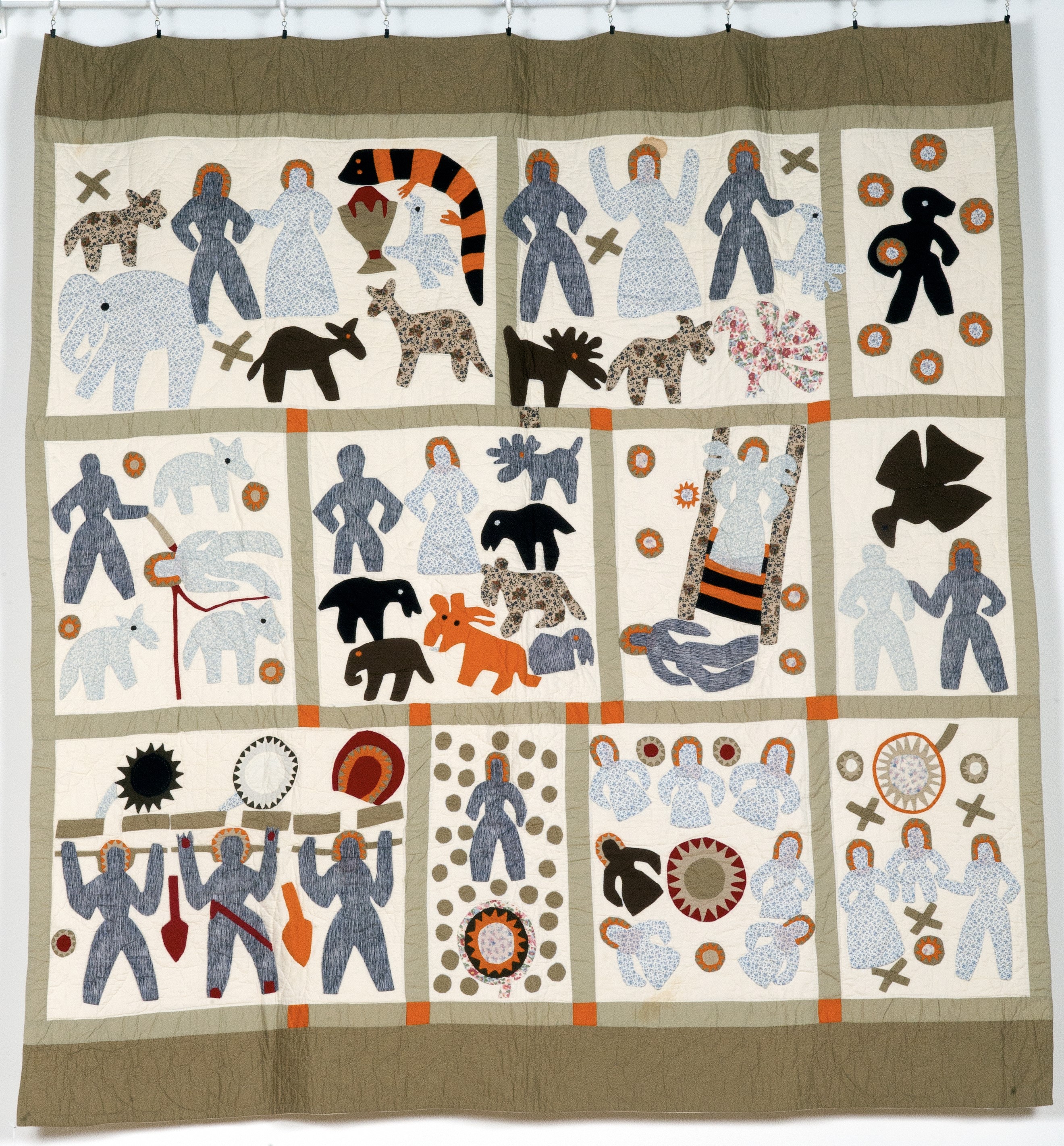 The second item is the Harriet Powers Bible Quilt, a1990s Smithsonian sponsored reproduction of a block style quilt. This iconic textile depicts eleven biblical scenes as originally designed by Harriet Powers, a woman born into slavery near Athens, Georgia in 1837. She is celebrated for her narrative quilts with design elements linked by historians to West African textile traditions. This quilt is on display on the 1st floor of the David L. Rice Library