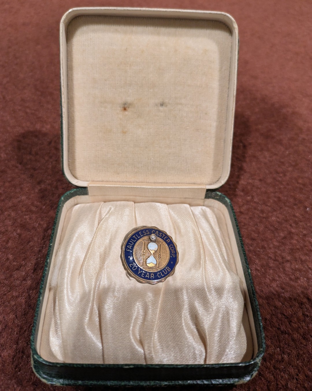 The second item is this Faultless Caster service pin. The Faultless Caster Company was a significant part of Evansville’s industrial landscape after relocating there in 1913, drawn by the city’s booming furniture-manufacturing industry. For much of the 20th century, its Garvin Street factory employed local workers and supplied casters nationwide, making it a quiet but important contributor to Evansville’s reputation as a Midwestern manufacturing hub.